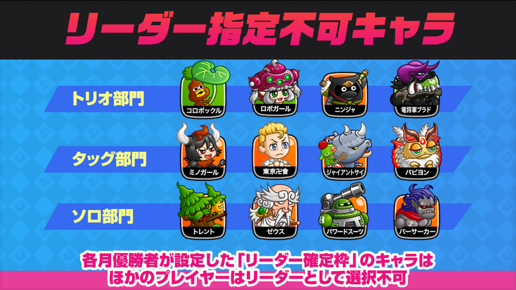 各月優勝者決定戦にて優勝者が設定した「リーダー確定枠」のキャラは、王者決定戦においてリーダーとして使用できません(ただし、ランダムデッキで選出された場合や、サブリーダーとしての使用には制限はありません)。